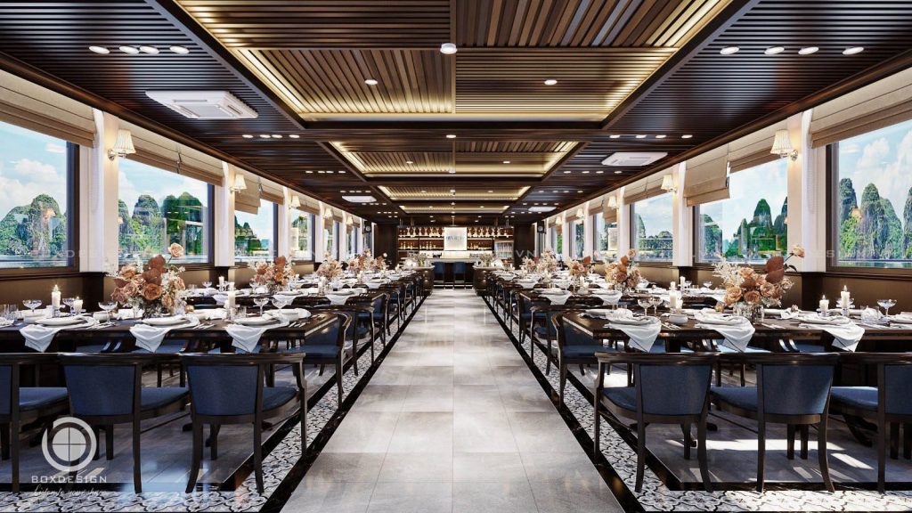 Du thuyền được thiết kế hiện đại: với nhiều góc check in, Cầu trượt hơi, khu vực tắm tráng, Không gian nhà hàng sang trọng …